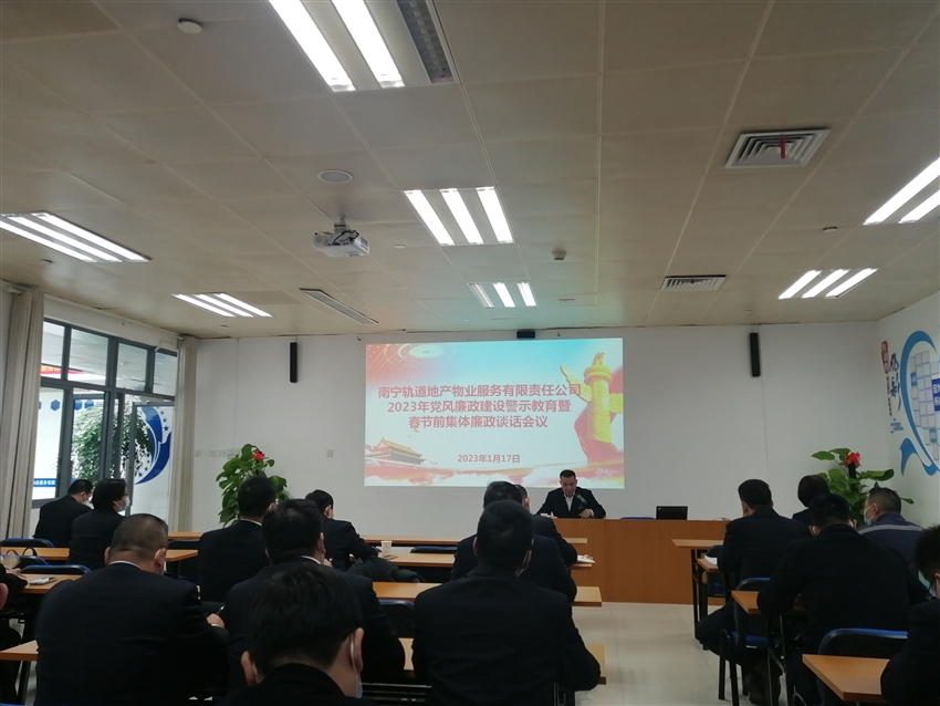 為深入學(xué)習(xí)貫徹黨的二十大及二十屆中央紀(jì)委二次全會(huì)會(huì)議精神,推進(jìn)公司全面從嚴(yán)治黨和黨風(fēng)廉政建設(shè)工作,增強(qiáng)全體黨員干部的廉潔自律意識(shí),營造風(fēng)清氣正的廉潔過節(jié)氛圍,2023年1月17日南寧軌道地產(chǎn)物業(yè)公司黨支部在東站樞紐培訓(xùn)室召開2023年黨風(fēng)廉政建設(shè)警示教育暨春節(jié)前集體廉潔談話,公司全體黨員、入黨積極分子、中層管理人員共47人參加了此次會(huì)議。