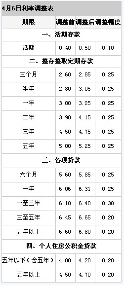 中國(guó)人民銀行決定,自2011年4月6日起上調(diào)金融機(jī)構(gòu)人民幣存貸款基準(zhǔn)利率。金融機(jī)構(gòu)一年期存貸款基準(zhǔn)利率分別上調(diào)0.25個(gè)百分點(diǎn),其他各檔次存貸款基準(zhǔn)利率及個(gè)人住房公積金貸款利率相應(yīng)調(diào)整(見(jiàn)附表)。